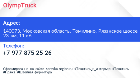 OlympTruck по адресу 140073, Московская область, Томилино, Рязанское шоссе 23 км, 11 к6 в дальнейшем Организация, размещена в следующих категориях: