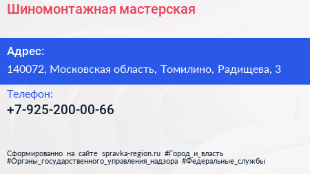 Шиномонтажная мастерская по адресу 140072, Московская область, Томилино, Радищева, 3 в дальнейшем Организация, размещена в следующих категориях: