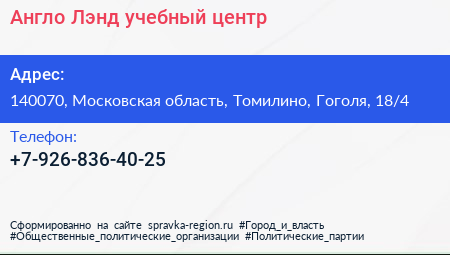 Англо-Лэнд, учебный центр по адресу 140070, Московская область, Томилино, Гоголя, 18/4 в дальнейшем Организация, размещена в следующих категориях: