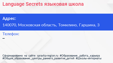 Language Secrets, языковая школа по адресу 140070, Московская область, Томилино, Гаршина, 3 в дальнейшем Организация, размещена в следующих категориях: