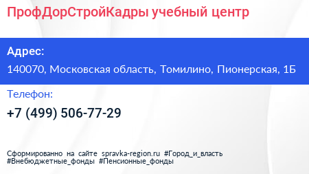 ПрофДорСтройКадры, учебный центр по адресу 140070, Московская область, Томилино, Пионерская, 1Б в дальнейшем Организация, размещена в следующих категориях: