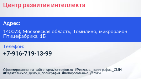 Центр развития интеллекта по адресу 140073, Московская область, Томилино, микрорайон Птицефабрика, 1Б в дальнейшем Организация, размещена в следующих категориях: