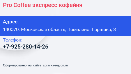 Pro Coffee, экспресс-кофейня по адресу 140070, Московская область, Томилино, Гаршина, 3 в дальнейшем Организация, размещена в следующих категориях: