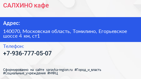 САЛХИНО, кафе по адресу 140070, Московская область, Томилино, Егорьевское шоссе 4 км, ст1 в дальнейшем Организация, размещена в следующих категориях: