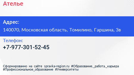 Ателье по адресу 140070, Московская область, Томилино, Гаршина, 3в в дальнейшем Организация, размещена в следующих категориях: