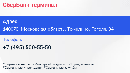 СберБанк, терминал по адресу 140070, Московская область, Томилино, Гоголя, 34 в дальнейшем Организация, размещена в следующих категориях: