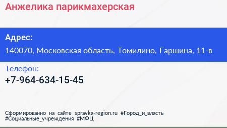 Анжелика, парикмахерская по адресу 140070, Московская область, Томилино, Гаршина, 11-в в дальнейшем Организация, размещена в следующих категориях: