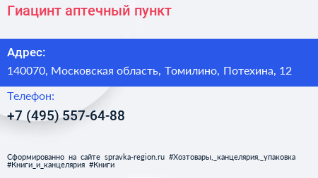 Гиацинт, аптечный пункт по адресу 140070, Московская область, Томилино, Потехина, 12 в дальнейшем Организация, размещена в следующих категориях: