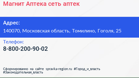 Магнит Аптека, сеть аптек по адресу 140070, Московская область, Томилино, Гоголя, 25 в дальнейшем Организация, размещена в следующих категориях:
