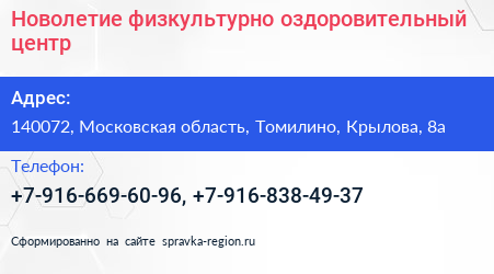 Новолетие, физкультурно-оздоровительный центр по адресу 140072, Московская область, Томилино, Крылова, 8а в дальнейшем Организация, размещена в следующих категориях: