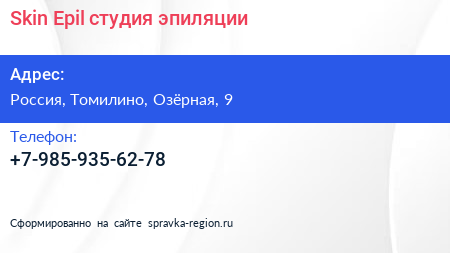 Skin Epil, студия эпиляции по адресу 9, Озёрная улица, Жилой комплекс «Люберцы 2018», Зенино, Люберцы, городской округ Люберцы, Московская область, Центральный федеральный округ, 140016, Россия в дальнейшем Организация, размещена в следующих категориях: