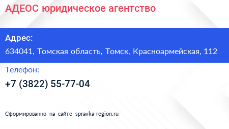 АДЕОС, юридическое агентство по адресу 634041, Томская область, Томск, Красноармейская, 112 в дальнейшем Организация, размещена в следующих категориях: