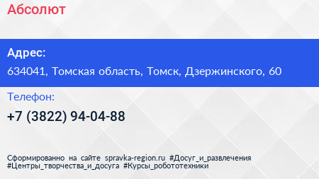 Абсолют по адресу 634041, Томская область, Томск, Дзержинского, 60 в дальнейшем Организация, размещена в следующих категориях: