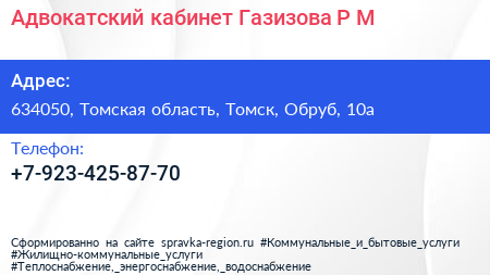 Адвокатский кабинет Газизова Р.М. по адресу 634050, Томская область, Томск, Обруб, 10а в дальнейшем Организация, размещена в следующих категориях: