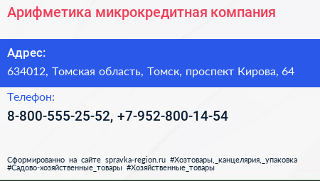 Арифметика, микрокредитная компания по адресу 634012, Томская область, Томск, проспект Кирова, 64 в дальнейшем Организация, размещена в следующих категориях: