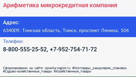 Арифметика, микрокредитная компания по адресу 634009, Томская область, Томск, проспект Ленина, 104 в дальнейшем Организация, размещена в следующих категориях: