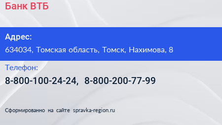 Банк ВТБ по адресу 634034, Томская область, Томск, Нахимова, 8 в дальнейшем Организация, размещена в следующих категориях: