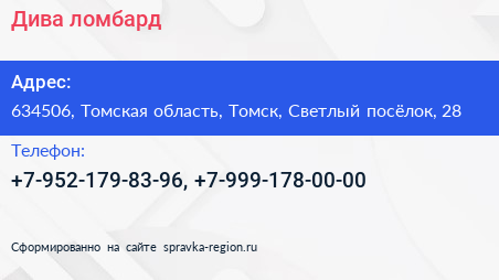Дива, ломбард по адресу 634506, Томская область, Томск, Светлый посёлок, 28 в дальнейшем Организация, размещена в следующих категориях: