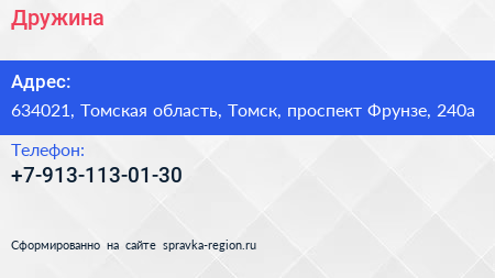 Дружина по адресу 634021, Томская область, Томск, проспект Фрунзе, 240а в дальнейшем Организация, размещена в следующих категориях: