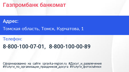 Газпромбанк, банкомат по адресу Томская область, Томск, Курчатова, 1 в дальнейшем Организация, размещена в следующих категориях: