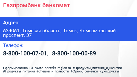 Газпромбанк, банкомат по адресу 634061, Томская область, Томск, Комсомольский проспект, 37 в дальнейшем Организация, размещена в следующих категориях: