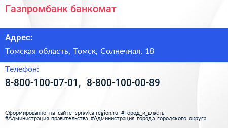 Газпромбанк, банкомат по адресу Томская область, Томск, Солнечная, 18 в дальнейшем Организация, размещена в следующих категориях: