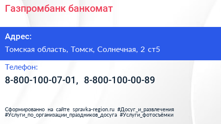 Газпромбанк, банкомат по адресу Томская область, Томск, Солнечная, 2 ст5 в дальнейшем Организация, размещена в следующих категориях: