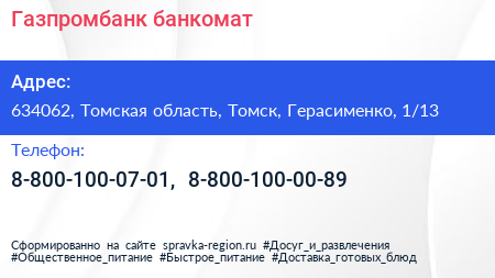 Газпромбанк, банкомат по адресу 634062, Томская область, Томск, Герасименко, 1/13 в дальнейшем Организация, размещена в следующих категориях: