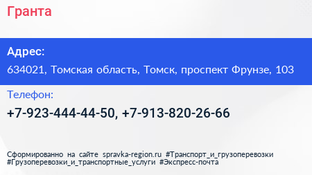 Гранта по адресу 634021, Томская область, Томск, проспект Фрунзе, 103 в дальнейшем Организация, размещена в следующих категориях: