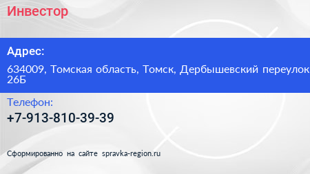 Инвестор по адресу 634009, Томская область, Томск, Дербышевский переулок, 26Б в дальнейшем Организация, размещена в следующих категориях: