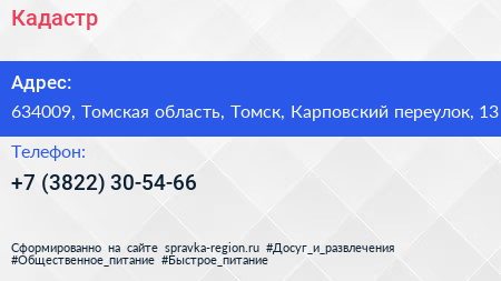 Кадастр по адресу 634009, Томская область, Томск, Карповский переулок, 13 в дальнейшем Организация, размещена в следующих категориях: