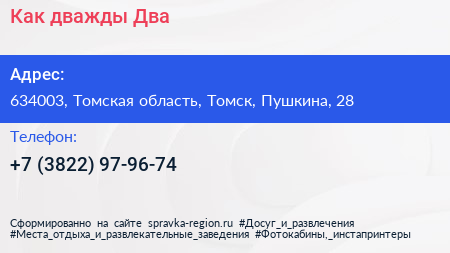 Как дважды Два по адресу 634003, Томская область, Томск, Пушкина, 28 в дальнейшем Организация, размещена в следующих категориях: