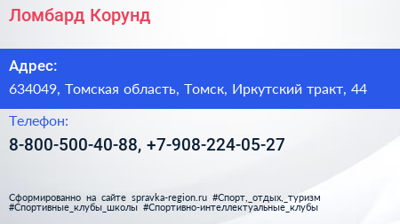 Ломбард Корунд по адресу 634049, Томская область, Томск, Иркутский тракт, 44 в дальнейшем Организация, размещена в следующих категориях:
