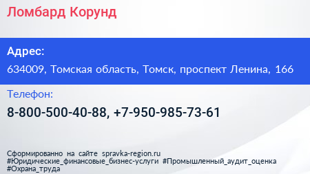 Ломбард Корунд по адресу 634009, Томская область, Томск, проспект Ленина, 166 в дальнейшем Организация, размещена в следующих категориях: