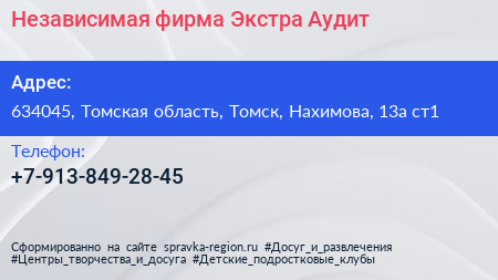 Независимая фирма Экстра-Аудит по адресу 634045, Томская область, Томск, Нахимова, 13а ст1 в дальнейшем Организация, размещена в следующих категориях:
