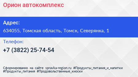 Орион, автокомплекс по адресу 634055, Томская область, Томск, Северянка, 1 в дальнейшем Организация, размещена в следующих категориях: