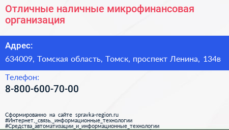 Отличные наличные, микрофинансовая организация по адресу 634009, Томская область, Томск, проспект Ленина, 134в в дальнейшем Организация, размещена в следующих категориях: