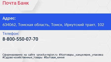Почта Банк по адресу 634062, Томская область, Томск, Иркутский тракт, 102 в дальнейшем Организация, размещена в следующих категориях: