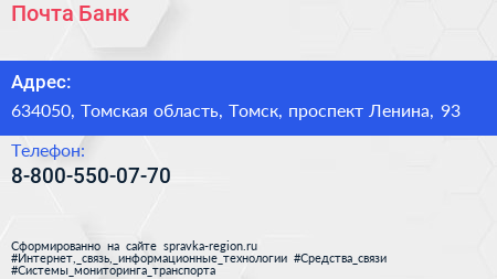 Почта Банк по адресу 634050, Томская область, Томск, проспект Ленина, 93 в дальнейшем Организация, размещена в следующих категориях: