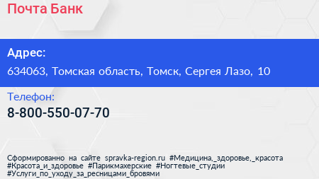 Почта Банк по адресу 634063, Томская область, Томск, Сергея Лазо, 10 в дальнейшем Организация, размещена в следующих категориях: