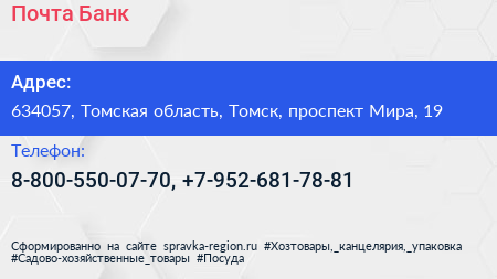 Почта Банк по адресу 634057, Томская область, Томск, проспект Мира, 19 в дальнейшем Организация, размещена в следующих категориях: