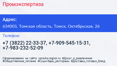 Промэкспертиза по адресу 634003, Томская область, Томск, Октябрьская, 26 в дальнейшем Организация, размещена в следующих категориях: