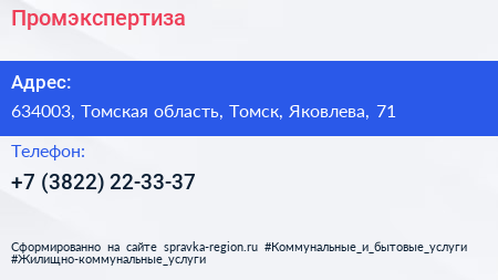 Промэкспертиза по адресу 634003, Томская область, Томск, Яковлева, 71 в дальнейшем Организация, размещена в следующих категориях: