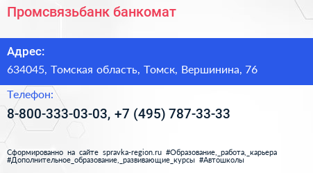 Промсвязьбанк, банкомат по адресу 634045, Томская область, Томск, Вершинина, 76 в дальнейшем Организация, размещена в следующих категориях: