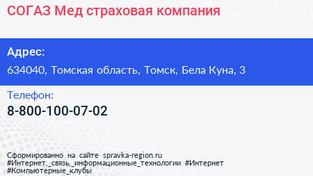 СОГАЗ-Мед, страховая компания по адресу 634040, Томская область, Томск, Бела Куна, 3 в дальнейшем Организация, размещена в следующих категориях: