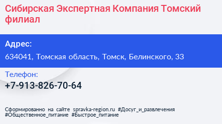 Сибирская Экспертная Компания, Томский филиал по адресу 634041, Томская область, Томск, Белинского, 33 в дальнейшем Организация, размещена в следующих категориях: