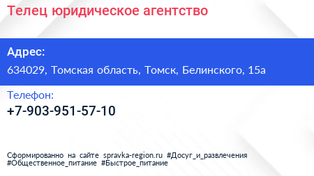 Телец, юридическое агентство по адресу 634029, Томская область, Томск, Белинского, 15а в дальнейшем Организация, размещена в следующих категориях: