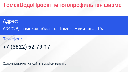 ТомскВодоПроект, многопрофильная фирма по адресу 634029, Томская область, Томск, Никитина, 15а в дальнейшем Организация, размещена в следующих категориях: