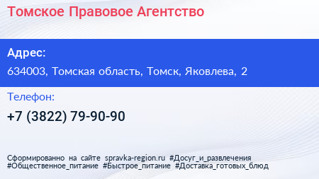 Томское Правовое Агентство по адресу 634003, Томская область, Томск, Яковлева, 2 в дальнейшем Организация, размещена в следующих категориях: