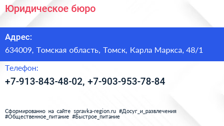 Юридическое бюро по адресу 634009, Томская область, Томск, Карла Маркса, 48/1 в дальнейшем Организация, размещена в следующих категориях: